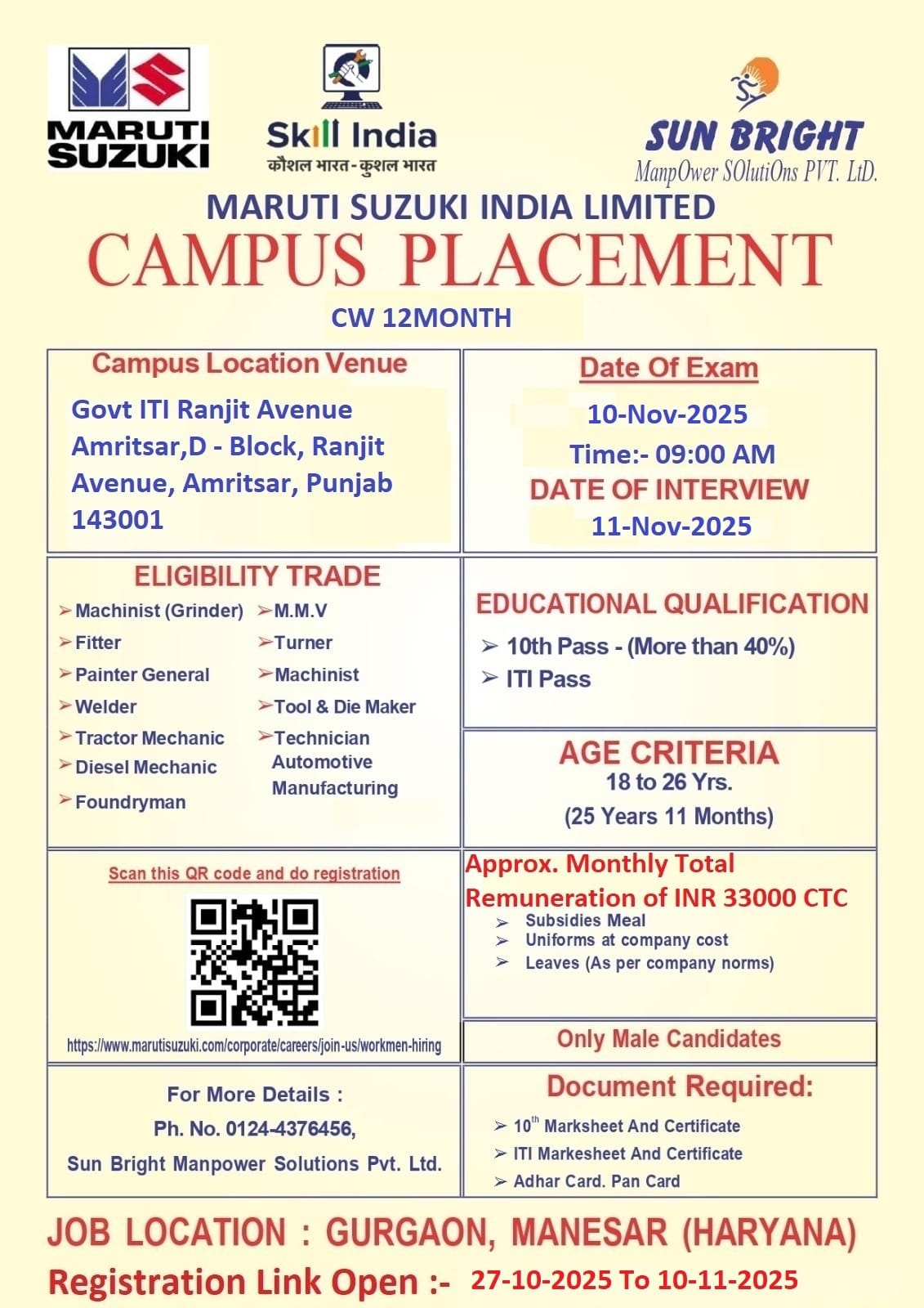 Maruti Suzuki Company Job vacancy 2025 (Gurgaon): प्रिय आईटीआई पास अभ्यार्थीयो आप सभी यदि Maruti Suzuki Company job vacancy 2025 के लिए इंतजार कर रहे है तो यह आप सभी किए लिए एक बेहतरीन अवसर है। आपकी जानकारी के लिए बता दें, Maruti Suzuki job के लिए Government ITI Ranjit Avenue Amritsar, D – Block, Ranjit Avenue, Amritsar, Punjab मे Campus Placement 2025 का आयोजन कीया जा रहा है। अतः सभी बेरोजगार अभ्यार्थी जो Maruti Suzuki Company के मानदंडों को पूर्ण करते है, वह Campus Drive मे सामिल हो सकते है। इस जॉब से संबंधित सम्पूर्ण जानकारी निम्न प्रकार है:-