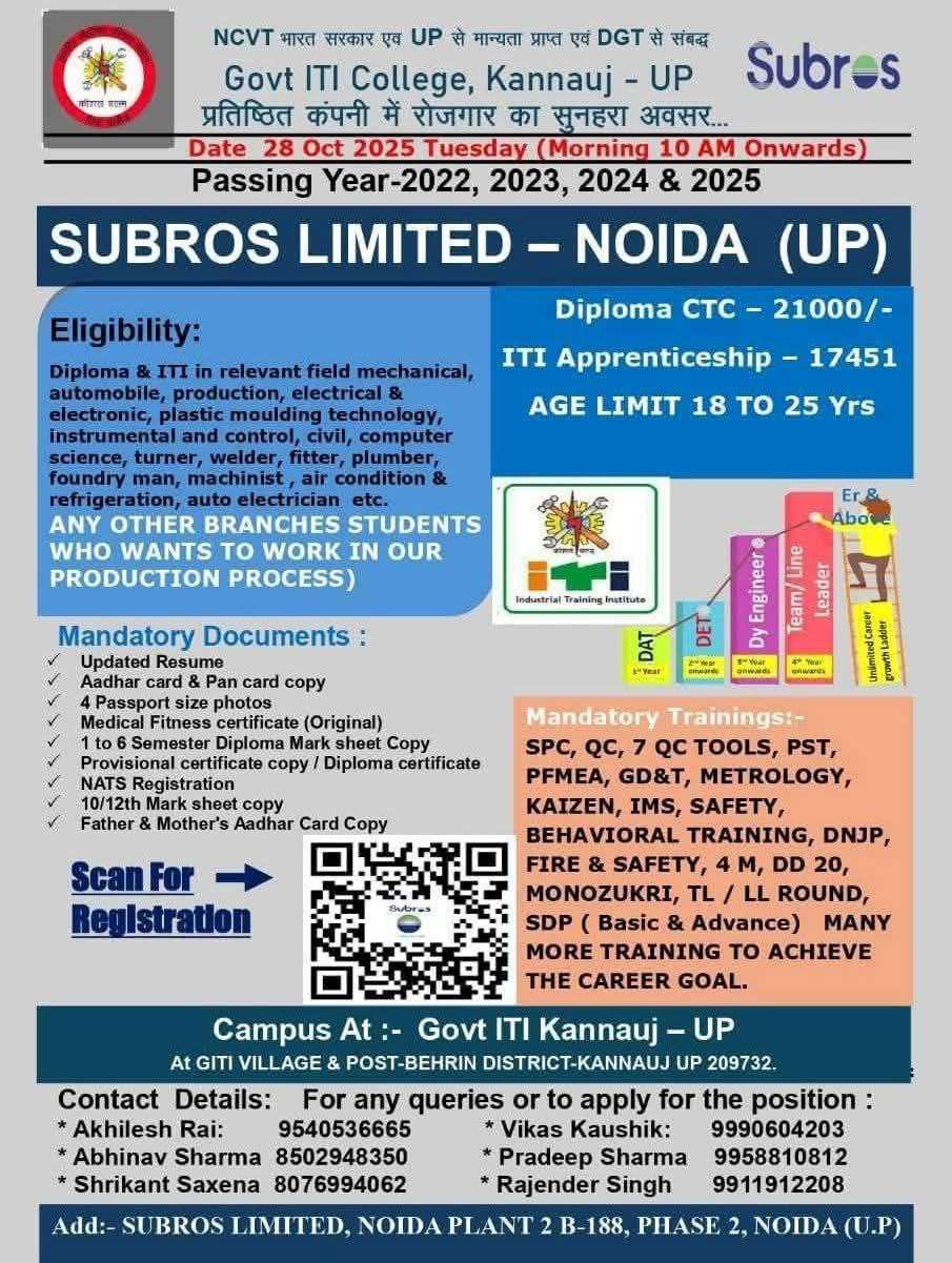 Subros Limited Recruitment 2025: सभी आईटीआई एवं डिप्लोमा पास कर चुके अभ्यार्थी जो की अभी एक बेहतरीन जॉब की तलाश मे है, उनके लिए एक अच्छी खबर है। प्रिय साथियों आपको इस जॉब के लिए Govt ITI Collage Kannauj, at GITI Village & Post Behrin Dist – Kannauj UP. मे अपने सभी जरूरी दस्तावेजों के साथ उपस्थित होना होगा। इस भर्ती के लिए जो भी जरूरी जानकारी है वो इस पोस्ट मे दी नीचे दी गई है:-