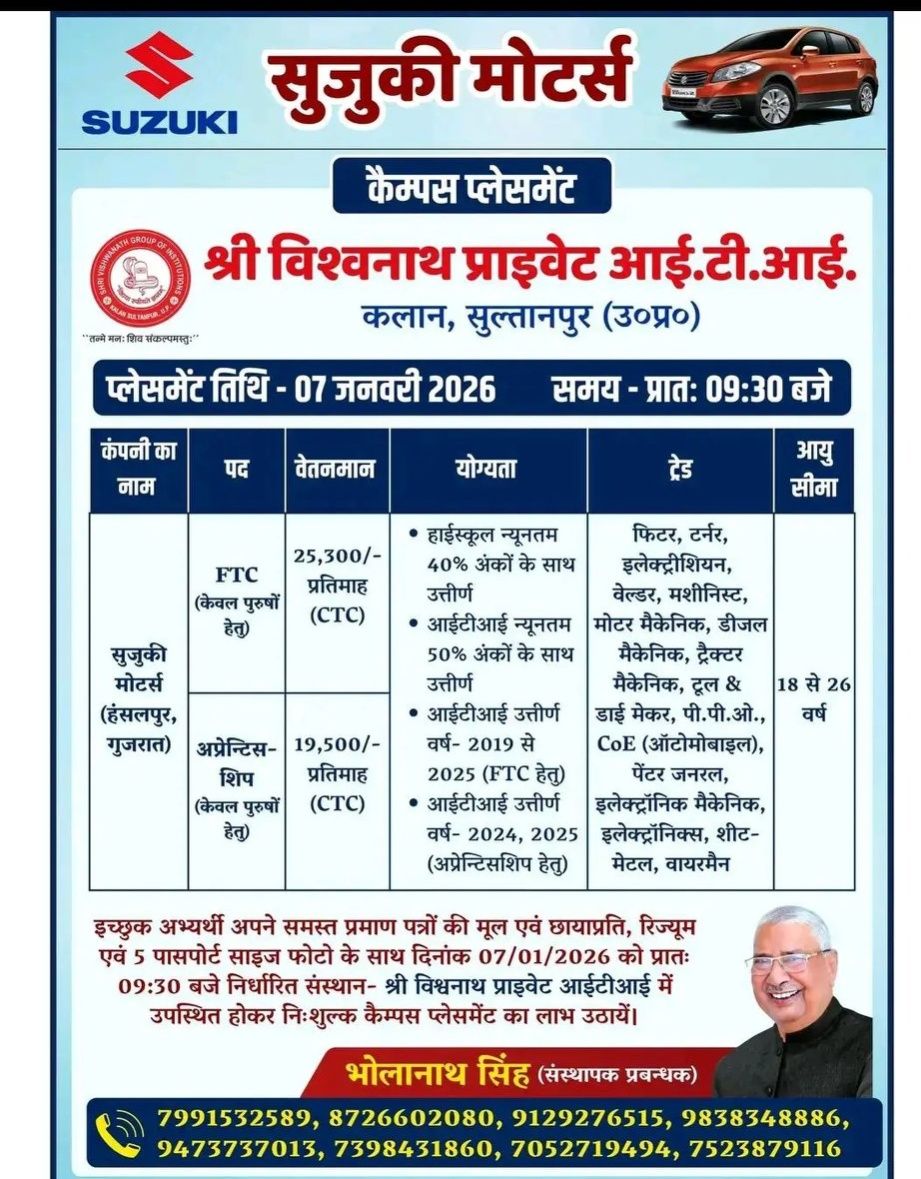 Campus Venue: श्री विश्वनाथ प्राइवेट आईटीआई, कलान, सुल्तानपुर, उत्तर प्रदेश।